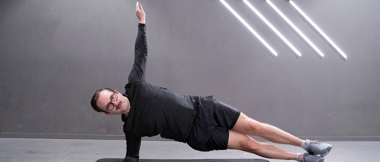Stå i en hög planka med armarna under axlarna och dra in knäna mot revbenen. I denna övningen tränar du bålstyrka och kondition.
