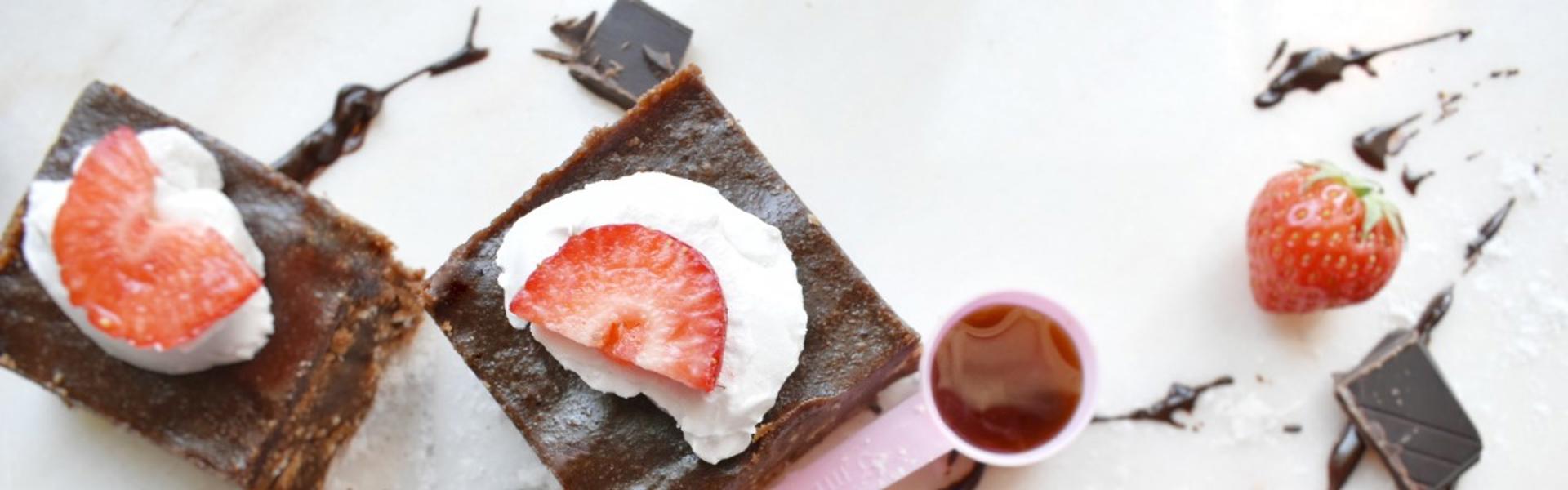 7. Dela upp brownien i lämpliga bitar, klicka på kokosgrädde och skiva på jordgubbar